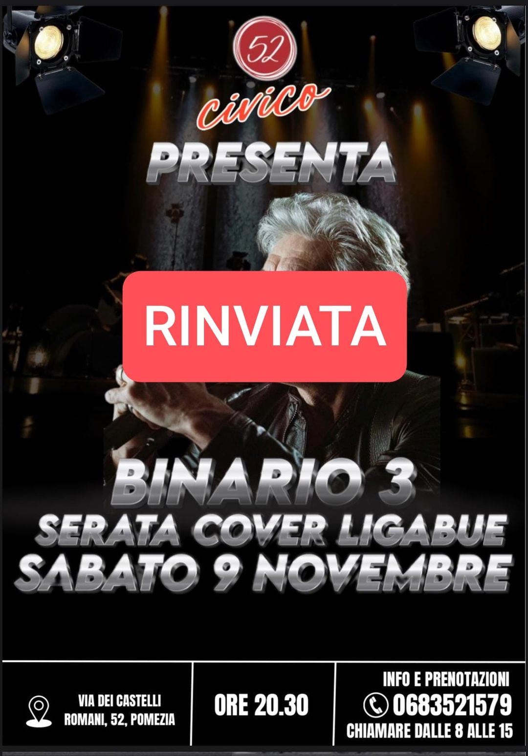 ci dispiace comunicarvi che la serata prevista per domani al Civico 52 di Pomezia è stata rinviata. Stiamo valutando la riprogrammazione, vi terremo aggiornati 👍