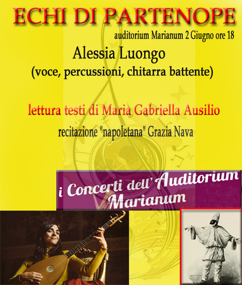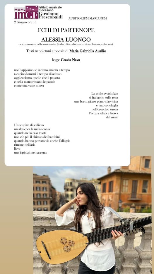 ECHI DI PARTENOPE – ALESSIA LUONGO Canto e strumenti della musica antica (tiorba, chitarra barocca e chitarra battente, colascione). Testi napoletani e poesie di Maria Gabriella Ausilio Legge, Grazia Nava Alessia Luongo nasce ad Avellino, vive a Roma. Γ musicista e musicologa: studia e ricerca la figura del commediante dell’arte da molti anni. Compone proprie partiture alla maniera antica. Studia al Conservatorio di Santa Cecilia di Roma nel dipartimento di Teoria e Analisi, Composizione e Direzione d’orchestra. Polistrumentista, si accompagna al canto con strumenti della musica antica (tiorba, chitarra barocca e chitarra battente, colascione). Esegue musiche che ha potuto recuperare riarrangiate da lei studiate da diverse fonti storiche orali e scritte. Attualmente lavora al suo nuovo album da solista dedicato all’opera buffa napoletana. Ad oggi Alessia Luongo cura anche un blog di ricerche musicologiche e teatrali sul suo sito web.