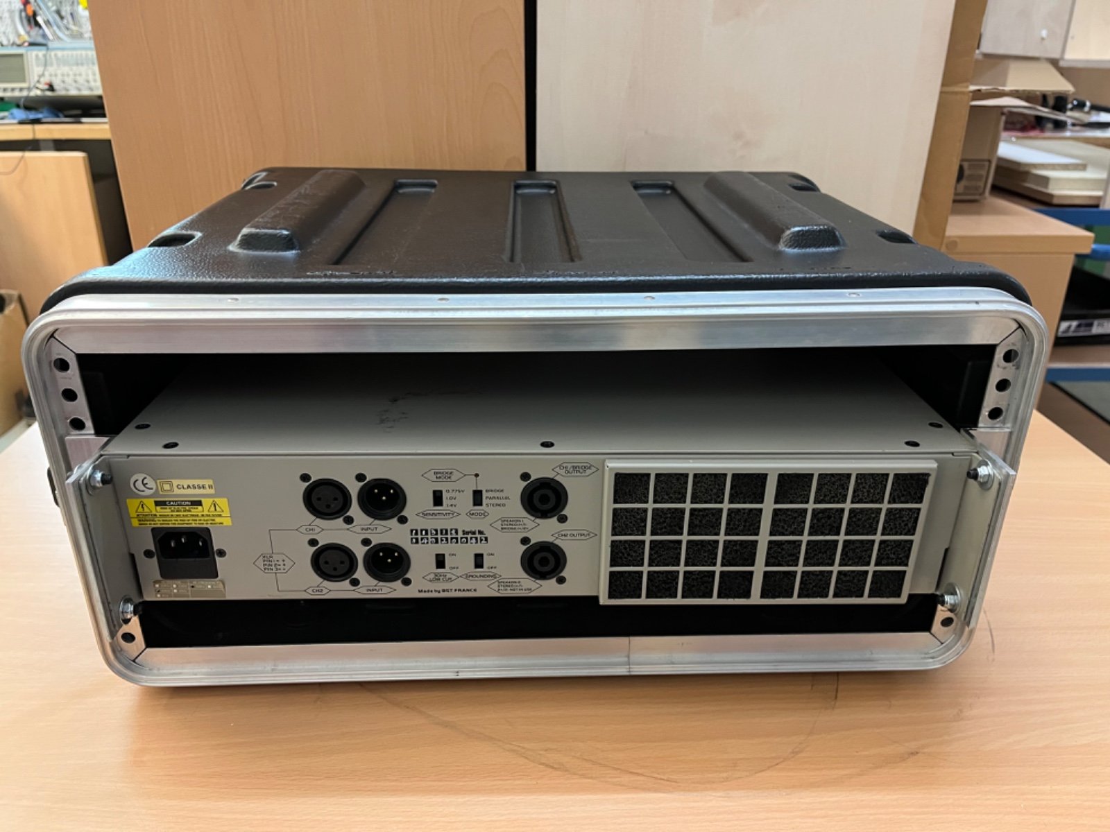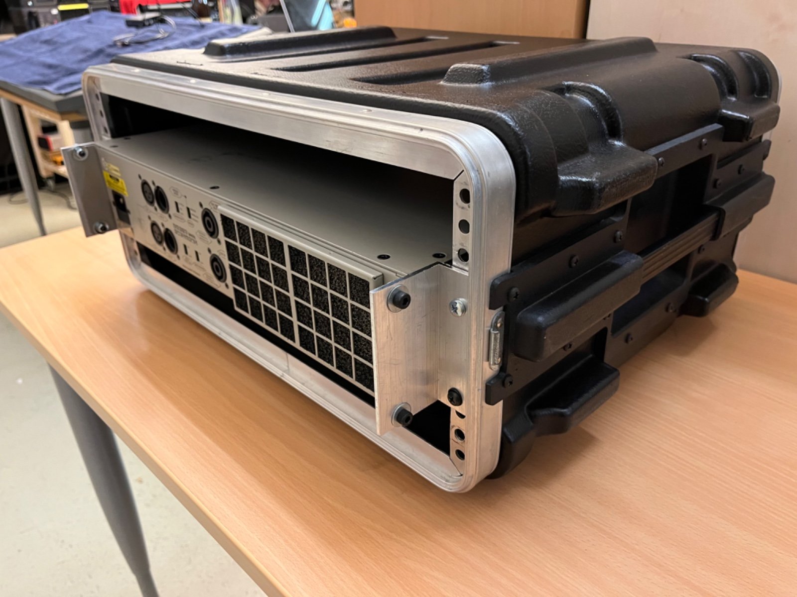 Die Verstärker sind fachmännisch in einem sehr gut erhaltenen Gehäuse eingebaut, an der Rückseite mit zusätzlichen Montagewinkeln verschraubt. (Rackcase optional und daher nicht in diesem Verkauf enthalten. Das Gehäuse hat oben und unten 1 HE offen für bessere Belüftung.)
