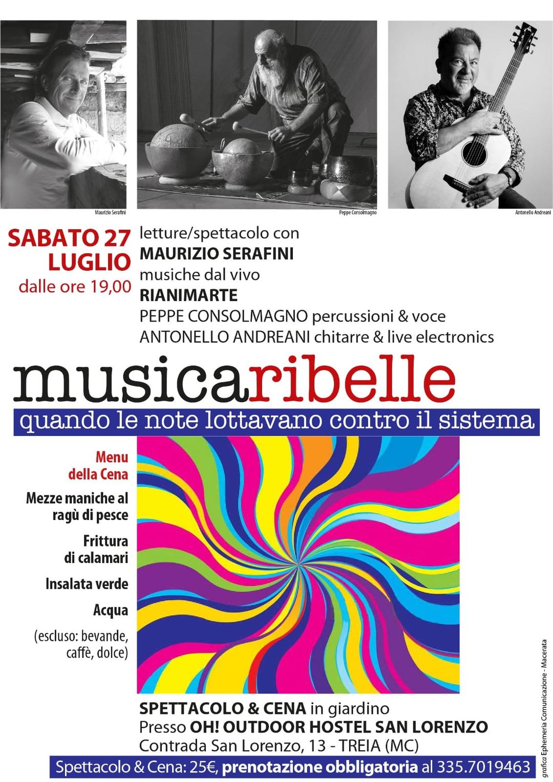 Sabato prossimo all’ OH – Outdoor Hostel San Lorenzo ci sarà una serata unica a cui vi invito a partecipare. In primis perché si svolge nel cortile di uno dei luoghi più panoramici delle Marche dove tra l’altro si mangia pure molto bene, poi finalmente potrò esporre quel che mi sta a cuore riguardo la musica ribelle e infine perchè come compagni di viaggio avrò due grandi amici e musicisti con cui non avevo a che fare da almeno 30 anni. Un vero rendez vous. Peppe Consolmagno e Antonello Andreani.