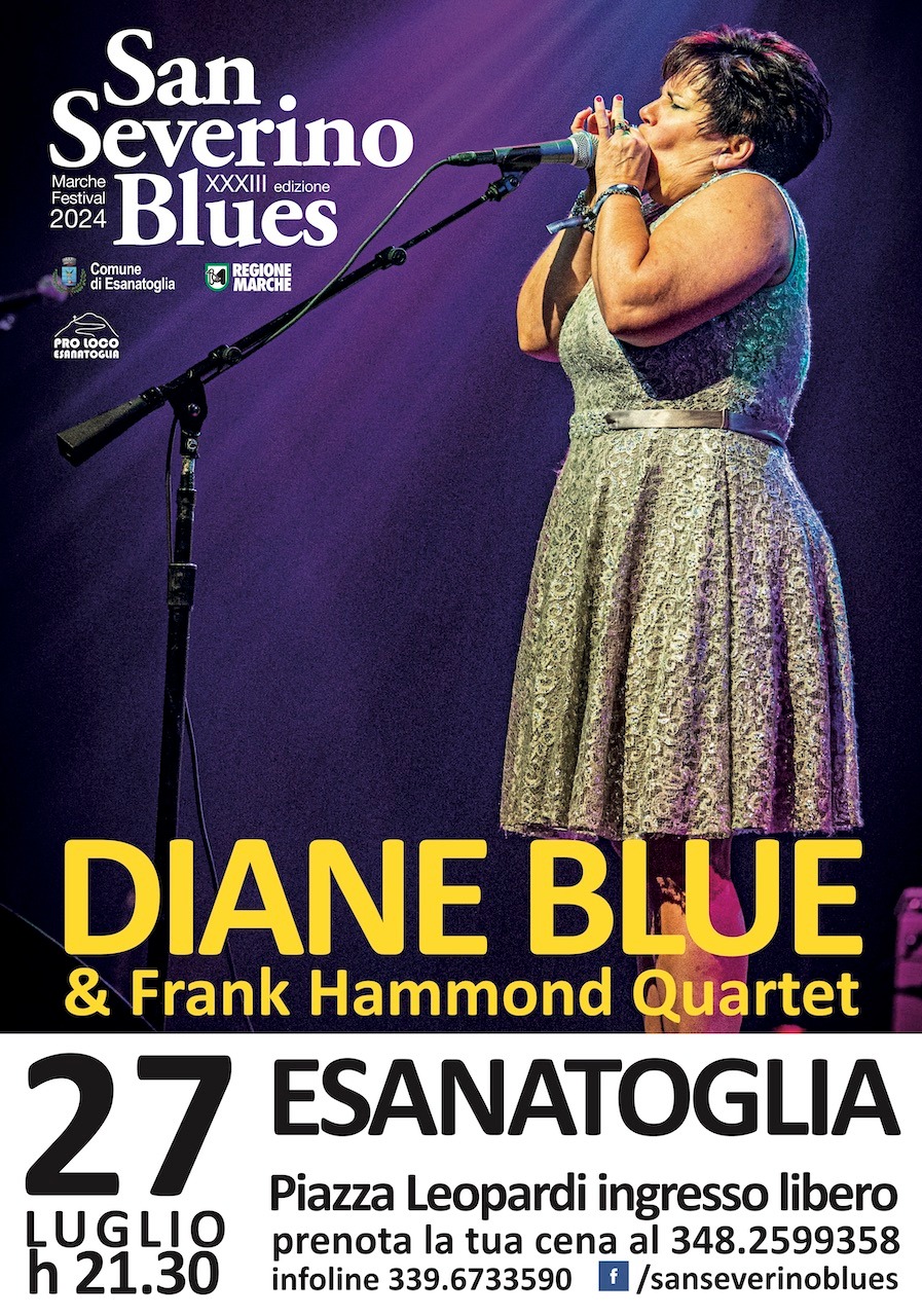 Stasera alle 21,30 avremo ad Esanatoglia in piazza del Comune (piazza Leopardi) la grande cantante ed armonicista americana 🎤 DIANE BLUE con il Frank Hammond quartet. Il concerto è gratuito e prima si potrà cenare, dalle 19,30, nel cortile del municipio grazie alla Pro Loco con il fritto di Lucia😋…. Altro